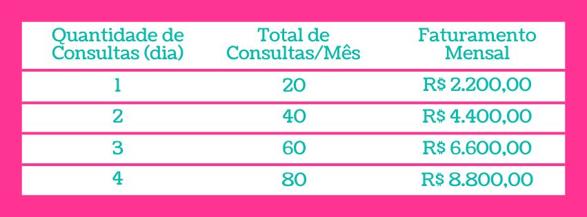Mesmo que você comece com apenas 2 atendimentos por semana, dedicando 4 horas de trabalho no total, já poderá gerar um faturamento inicial de R$ 880,00. Para referência, minhas consultas online custam R$ 190,00 e, no consultório, R$ 250,00. Abro aqui esses valores para que você possa visualizar o potencial. Afinal, como dizem: “Se você acredita que é possível ou impossível, de qualquer forma, está certa”.